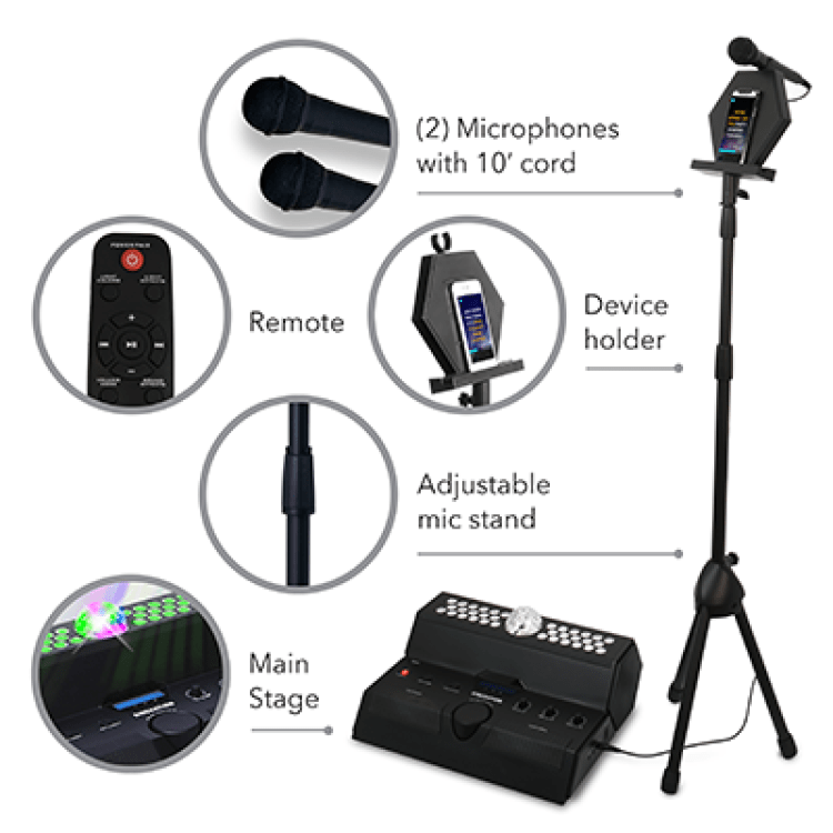 The Singsation Main Stage All-In-One Party System has everything a performer needs to dazzle an audience. It has 60 voice-changing settings, 25 color-changing light modes and 10 sound effects to create an audio and visual spectacle that will blow the lid off your performance. The wireless speaker generates big, room-filling sound. Two microphones are included so you can share the spotlight with your favorite co-star. The microphone stand is adjustable and incorporates a cradle to hold your smartphone or tablet which you can pair to sing along to your favorite music or YouTube® videos. Go ahead and bring the house down because everyone can be a star!